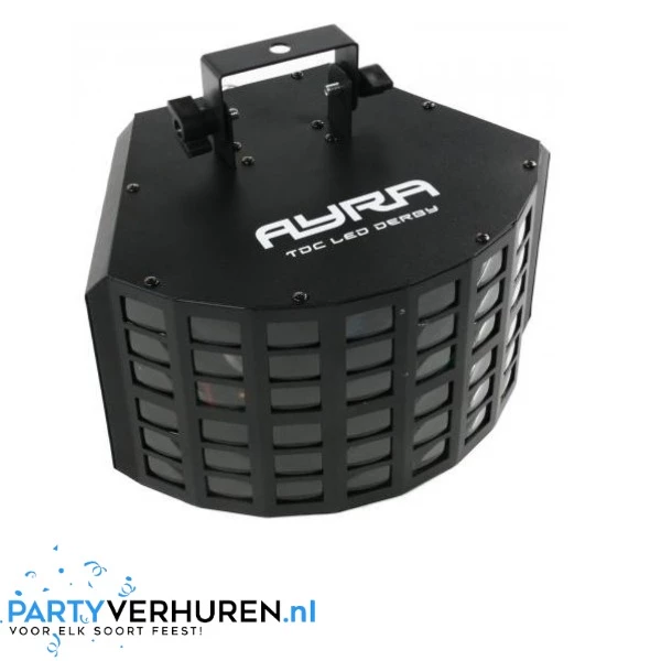 The LED Derby is a lamp that spreads colored light rays through a room. It is also possible to have the lamp controlled by your music via a special microphone built into the lamp. This makes the derby ideal for a wide range of festive events.