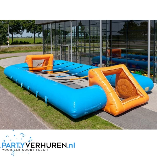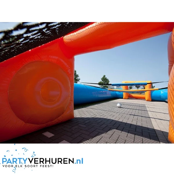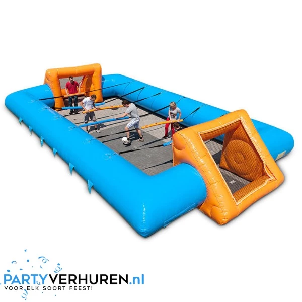 Dit leuke, sportieve levend tafelvoetbalspel is gebaseerd op het tafelvoetbalspel, maar het leuke aan dit spel is dat de spelers de levende voetballers zijn! Je zit met een handvat vast aan de “stangen” binnen de boarding. Door het unieke schuifsysteem kun je gemakkelijk heen en weer schuiven. Door de hoge boarding zal de bal niet zo snel buiten het veld worden getrapt. Scoor jij met je team de meeste doelpunten.
