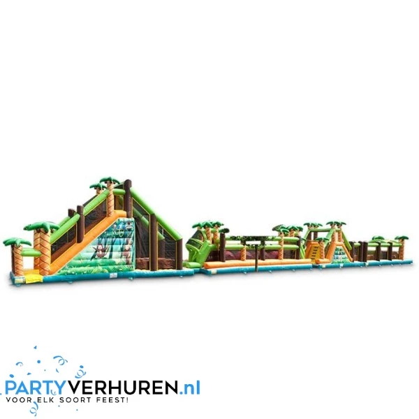 Huur de Mega Run Jungle Stormbaan van maar liefst 46,5 meter lang voor uw evenement. Om het einde van de stormbaan te bereiken dienen de deelnemers over verschillende obstakels, klim- en glijonderdelen, megaballen te klauteren en kruipen en een uitdagende base jump te maken.
