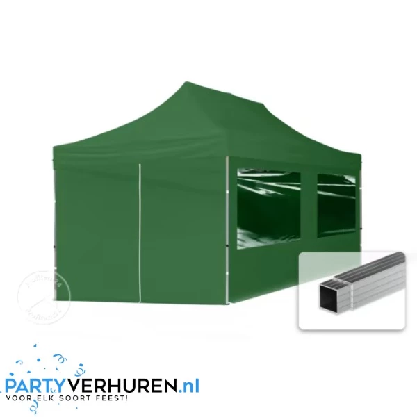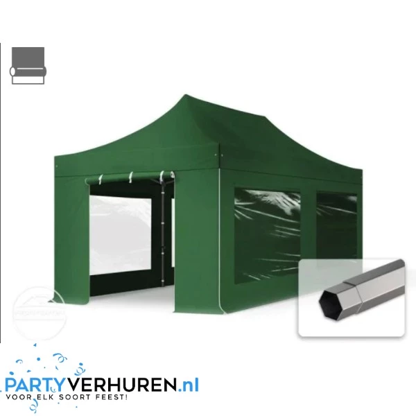 Handige tent huren die makkelijk op te zetten is? Deze mooie donkergroene 3m x 6m easy-up tent heeft een harmonicasysteem. De partytent staat binnen 15 minuten en is volledig waterdicht (dak van zware kwaliteit) PVC coated polyester.