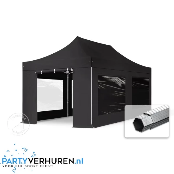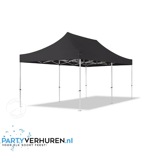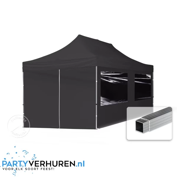Handige tent huren die makkelijk op te zetten is? Deze mooie zwarte 3m x 6m easy-up heeft een harmonicasysteem. De tent staat binnen 15 minuten en is volledig waterdicht (dak van zware kwaliteit) PVC coated polyester.